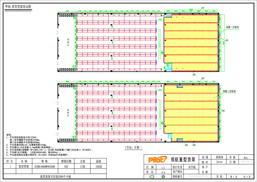 重型貨架由于存儲物品較重,需配合卡板和叉車使用。這次我們設計的高位重型貨架高度是8.1米,四層橫梁五層存放。客戶使用窄通道叉車,我們設計的通道≥2.2米,雙排重型貨架之間用250mm的拉桿連接,并結合客戶使用的是1200(入叉)*1000mm的卡板,重型貨架尺寸設計為: L2700*W900*H8100mm。