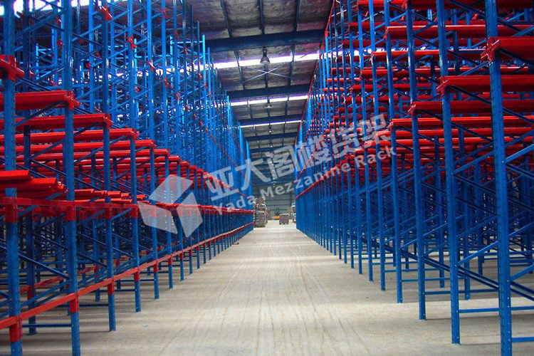壓入式貨架儲存模式是將托盤貨物通過載貨的小車依次的進行逐個后推進行儲存,叉車無需進入巷道內,作業效率高。